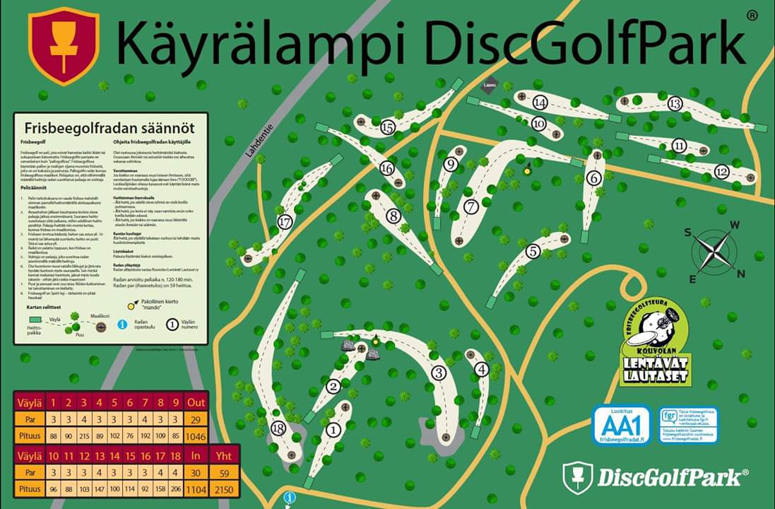 Infotaulu löytyy kuntopolun alikulun Käyrälammen puolelta. Ensimmäinen väylä alikulun jälkeen kuntopolun vasemmalta puolelta. Jokaisessa korissa on koriosassa nuoli kohti seuraavaa heittopaikkaa.