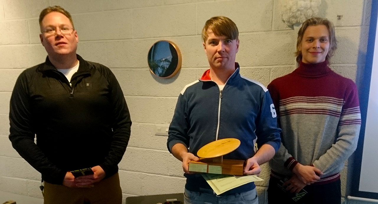 Vuoden 2018 seuramestaruuskilpailujen kärkikolmikko. 1. Lasse Hirvonen (keskellä) 2. Niko Koskimaa (vasemmalla) 3. Anton Ukkola.