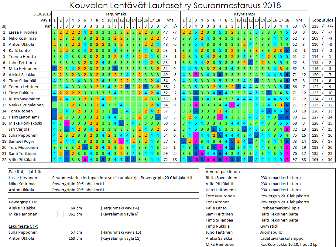 Kouvolan Lentävien Lautasten seuramestaruuskilpailut 2018 pelattiin jo tutuksi käyneen kaavan mukaan Harjunmäen sekä Käyrälammen frisbeegolfradoilla lauantaina 6.10.2018.